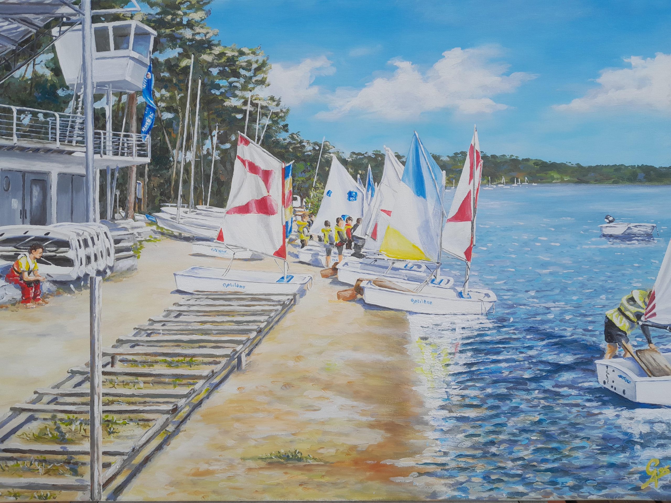 L’école de voile de la Grande Escoure, Lac de Lacanau. (Acrylique sur toile 70×50)